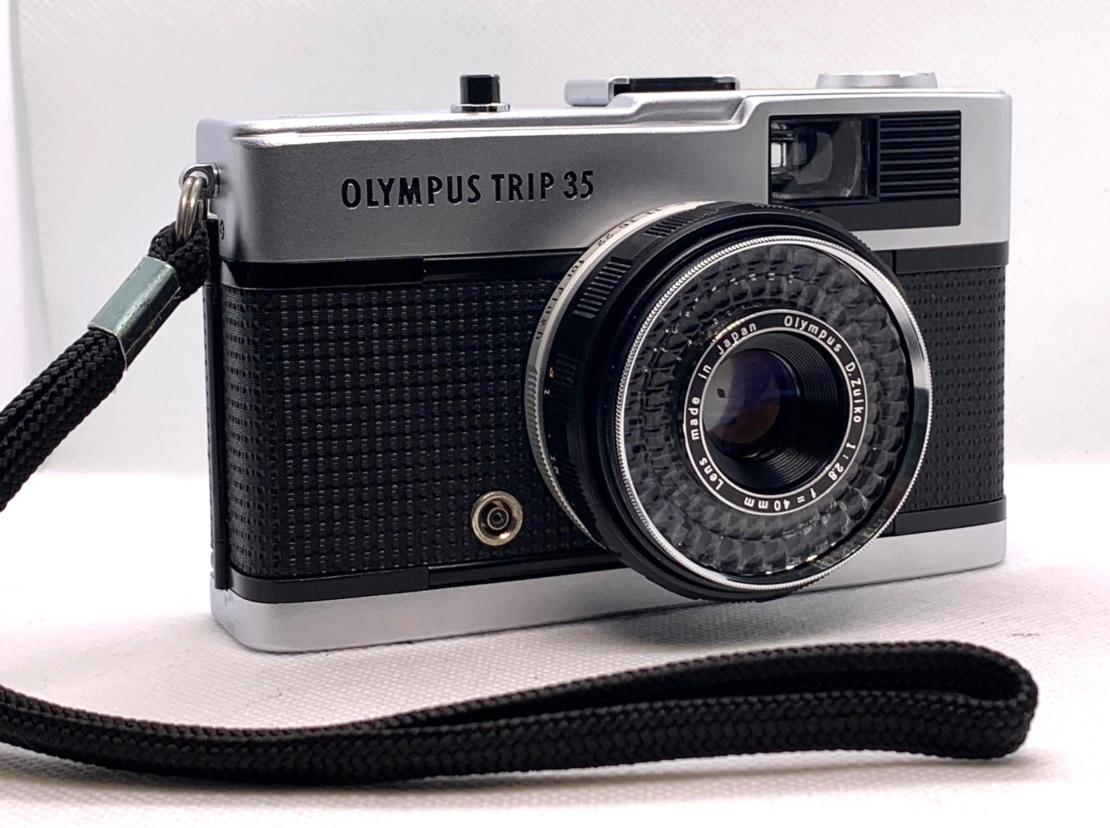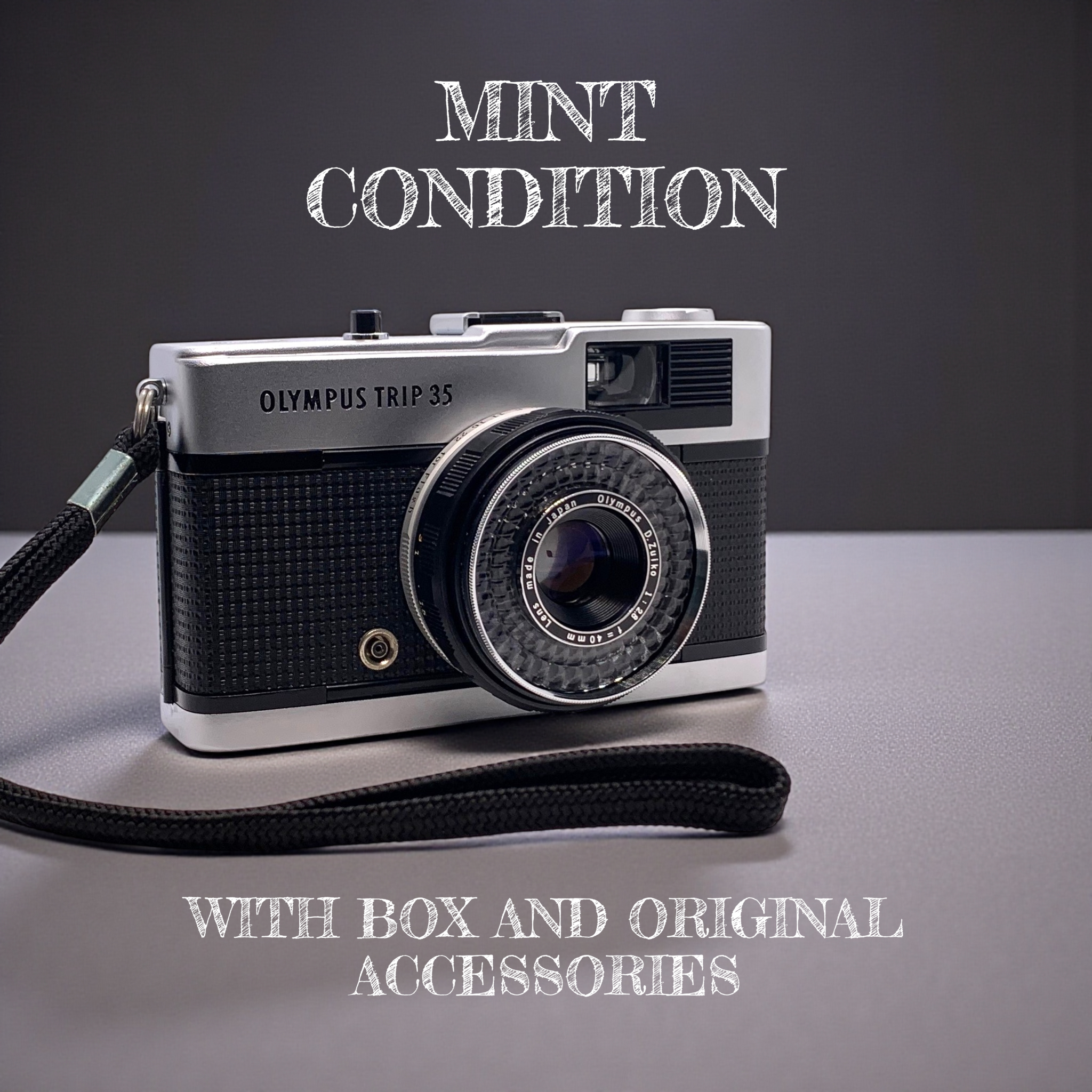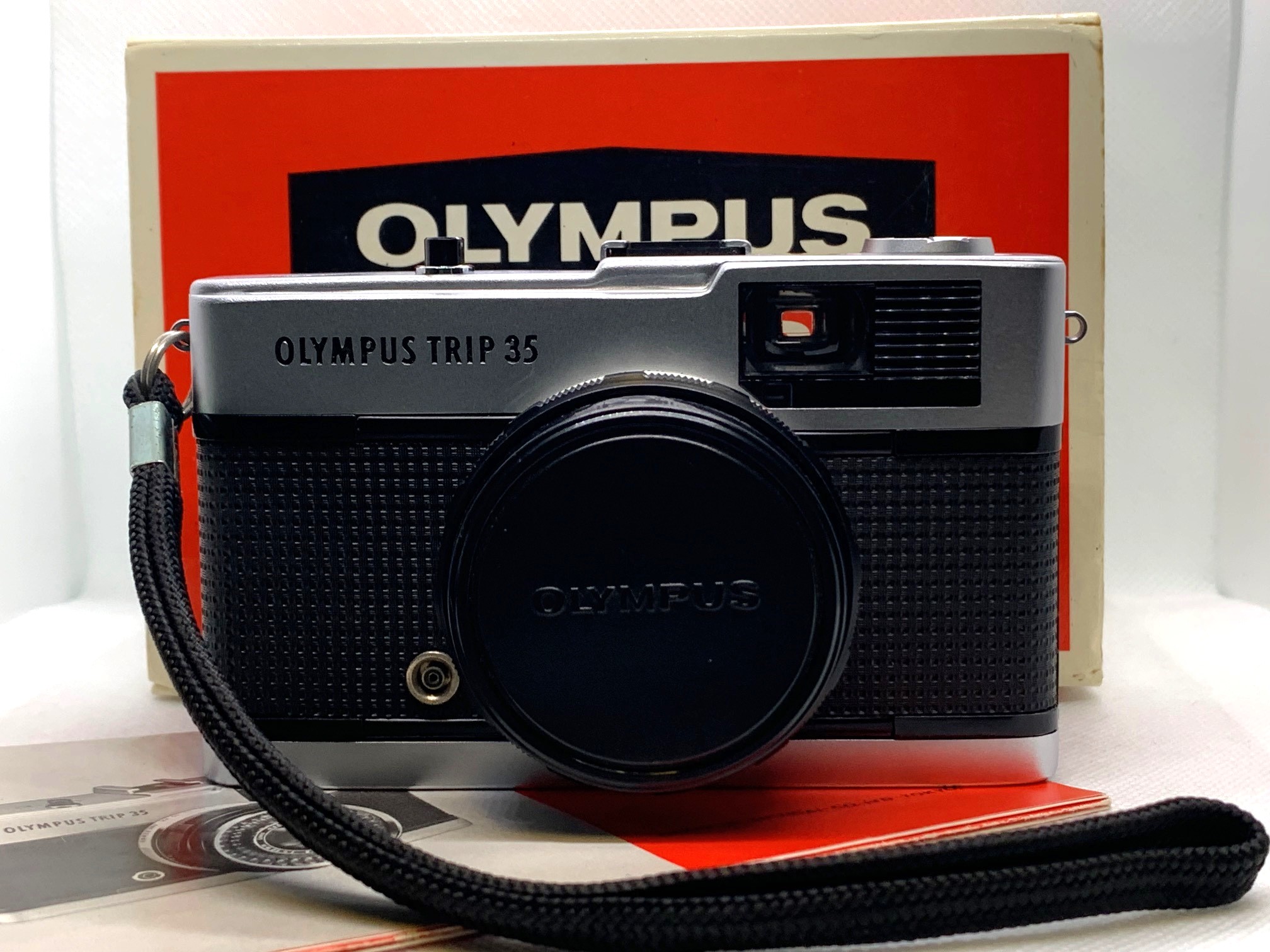 A Top Pics Camera! Mint Condition Olympus Trip 35 with all original accessories, box and instructions. Even the wrist strap still has the blue protective film on the clasp.